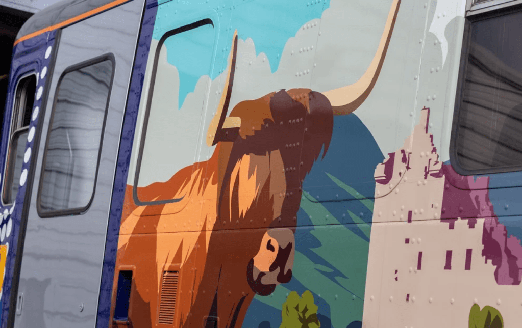 The five new carriages feature a new “active travel” livery designed by artist Peter McDermott, depicting some of the most iconic landmarks along the West Highland line, including the Glenfinnan viaduct, Ben Lomond and the castle on Loch Awe, plus the almost obligatory highland cow.