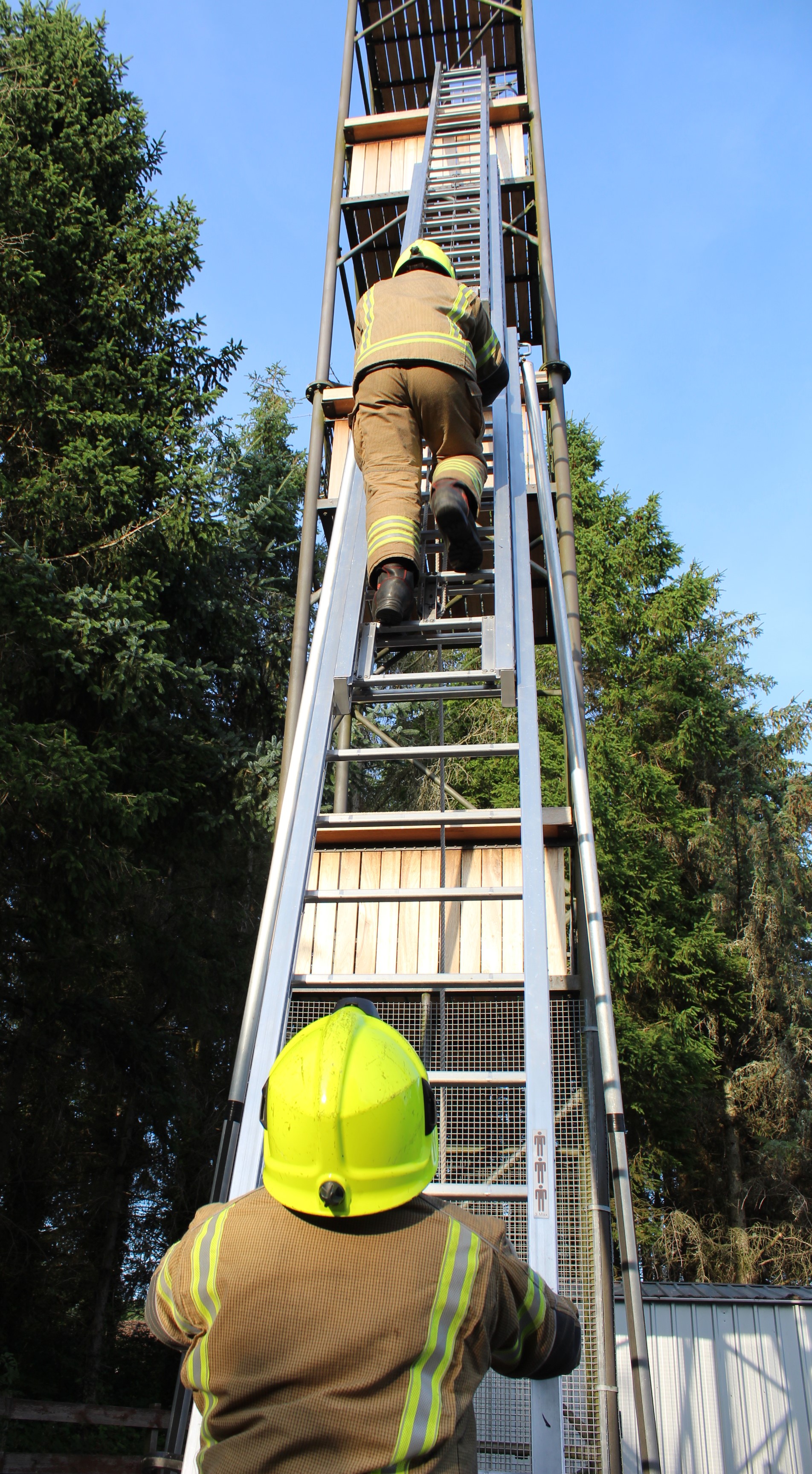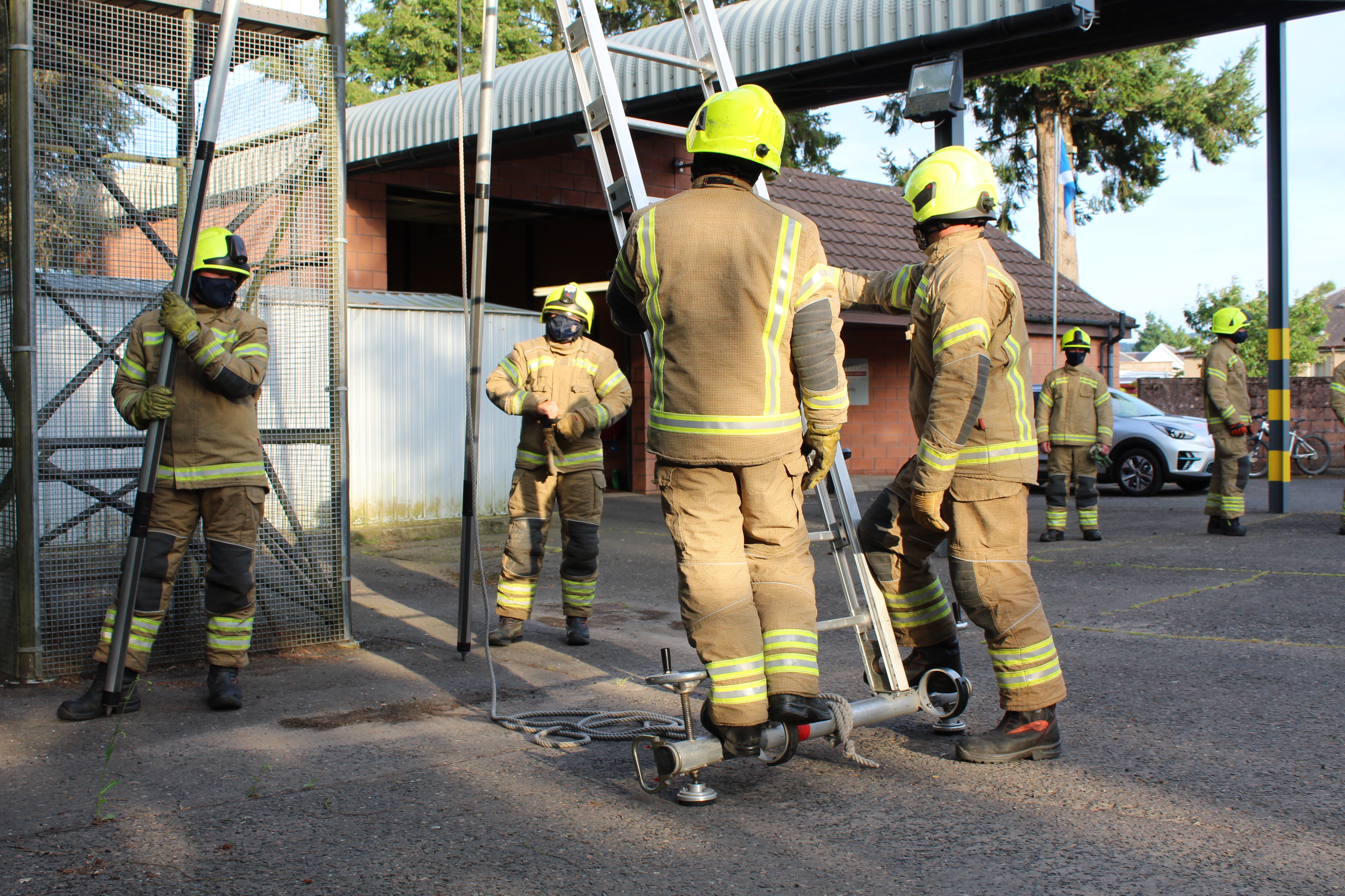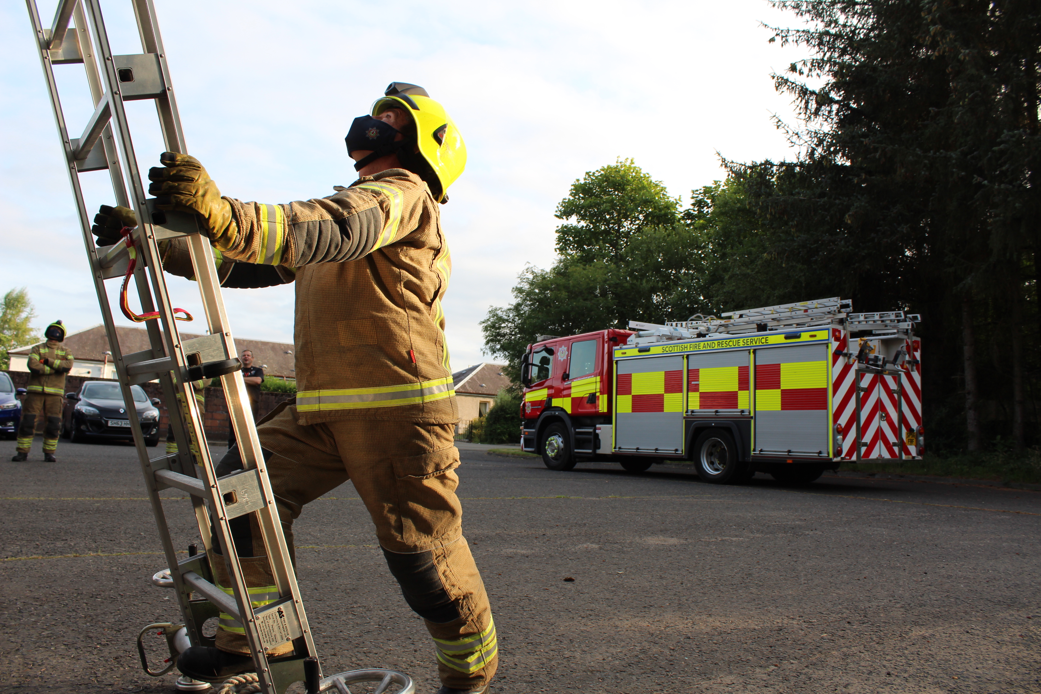 The Comrie station is crewed by a roster of 13 firefighters, one of whom is a woman. Retained firefighters can come from all sorts of professional backgrounds, but a large proportion of the crew at Comrie work in the building trades. When SiM visited the station, the firefighters were carrying out ladder and hose drills as part of their regular weekly training routine.